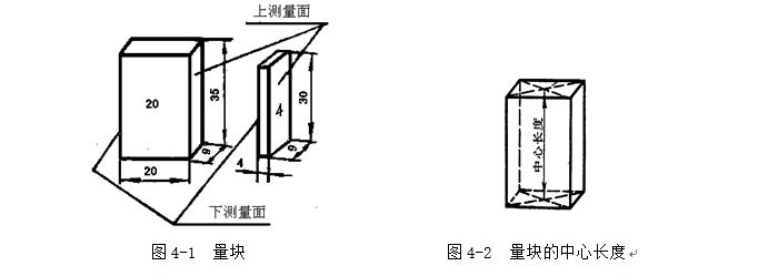 長度量塊是用耐磨性好,硬度高而不易變形的軸承鋼制成矩形截面的長方塊,如圖4-1所示。它有上、下兩個(gè)測(cè)量面和四個(gè)非測(cè)量面。兩個(gè)測(cè)量面是經(jīng)過精密研磨和拋光加工的很平、很光的平行平面。量塊的矩形截面尺寸是:基本尺寸0.5~10mm的量塊,其截面尺寸為30mm×9mm;基本尺寸大于10至1000mm,其截面尺寸為35mm×9mm。
