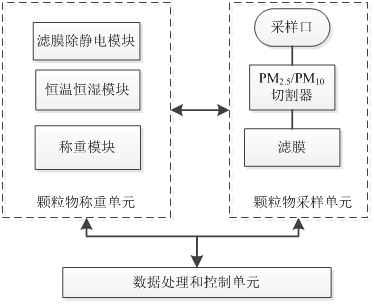 儀器的工作原理為:空白濾膜處于恒溫恒濕環(huán)境下恒重并稱(chēng)取初始質(zhì)量之后,自動(dòng)安裝在采樣濾膜支架上,由顆粒物采樣單元以恒定的流量抽取環(huán)境空氣樣品,并進(jìn)行切割分離和濾膜收集,采樣后的濾膜進(jìn)入顆粒物稱(chēng)重單元,經(jīng)恒溫恒濕環(huán)境下恒重和除靜電后進(jìn)行稱(chēng)重測(cè)量。數(shù)據(jù)處理和控制單元控制整個(gè)測(cè)量過(guò)程、參數(shù)采集和測(cè)量結(jié)果的分析、計(jì)算和顯示。