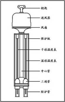 通風(fēng)干濕表的構(gòu)造如圖所示,主要由干濕球溫度表、通風(fēng)器、附件組成。通風(fēng)器采用機(jī)械裝置對(duì)干濕球溫度表的感應(yīng)球部進(jìn)行強(qiáng)制通風(fēng),保證感應(yīng)球部周圍的通風(fēng)速度穩(wěn)定在2.5m/s。干濕球溫度表的感應(yīng)球部裝在雙重金屬護(hù)管內(nèi),護(hù)管通過三通管和中央圓管與通風(fēng)器相通。儀器附件有濕潤紗布用的吸儲(chǔ)水橡皮囊、擋風(fēng)罩等。由于通風(fēng)干濕表表面鍍有反射性能很好的鎳或鉻,同時(shí)溫度表感應(yīng)球部又處于能防止熱傳導(dǎo)的雙重護(hù)管中,所以通風(fēng)干濕表可以在太陽光下進(jìn)行觀測,是野外觀測的常用儀器,但由于有金屬機(jī)械部分,因此不能在雨天使用,以免機(jī)械生銹。
