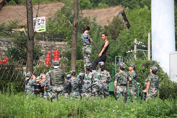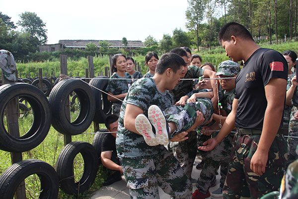 男隊員主動擔任底座,用自己的肩膀、大腿為其他隊員豎起一座通往勝利的人梯;已經(jīng)翻越的同事緊緊抓住下面隊員的手臂,拼盡全力;等待翻越的隊員伸出自己的雙手,時刻準備著為其他隊員提供保護。同時有條不紊地向上攀登著。時間一分一秒的過去,隊員們也一個一個翻越了畢業(yè)墻。14分23秒,全部隊員翻越完畢,代表著我們的拓展訓練順利畢業(yè)了。