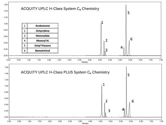 圖1. 分別在ACQUITY UPLC H-Class和ACQUITY UPLC H-Class PLUS系統(tǒng)上使用ACQUITY UPLC BEH C8色譜柱填料分離各種防曬霜活性成分標(biāo)準(zhǔn)品得到的疊加色譜圖。