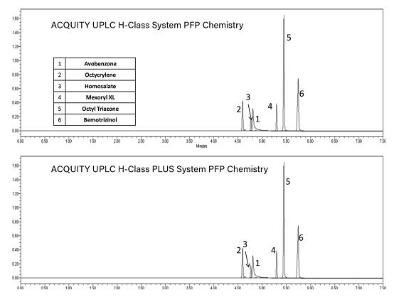 圖2.分別在ACQUITY UPLC H-Class和ACQUITY UPLC H-Class PLUS系統(tǒng)上使用ACQUITY UPLC HSS PFP色譜柱分離各種防曬霜活性成分標(biāo)準(zhǔn)品得到的疊加色譜圖。