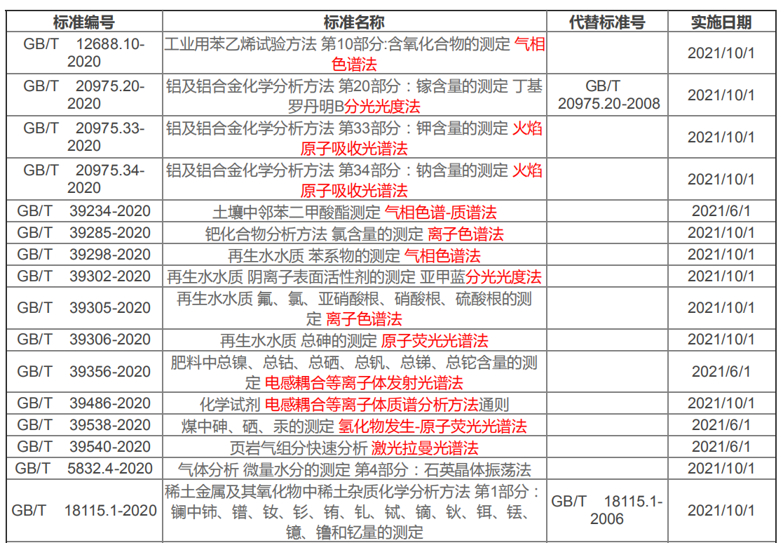 批準(zhǔn)發(fā)布586項推薦性國家標(biāo)準(zhǔn)中,數(shù)十條涉及了光譜、色譜、質(zhì)譜分析方法,包括氣相色譜法、火焰原子吸收光譜法、氣相色譜-質(zhì)譜法、離子色譜法、電感耦合等離子體發(fā)射光譜法、電感耦合等離子體質(zhì)譜分析方法、氫化物發(fā)生-原子熒光光譜法、激光拉曼光譜法等。