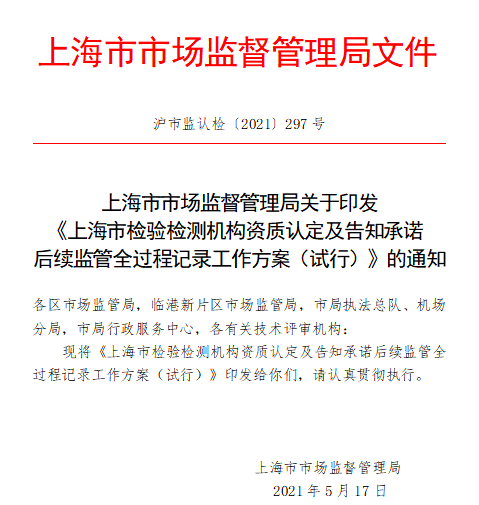 上海市檢驗檢測機構資質認定及告知承諾后續監管全過程記錄工作方案(試行)