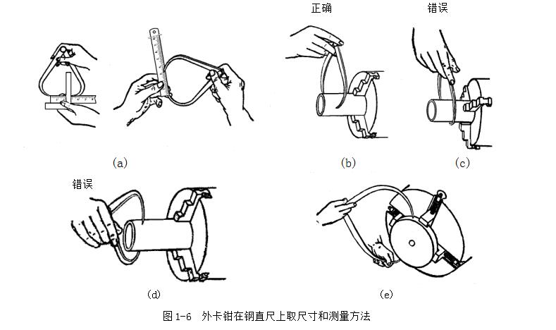 用巳在鋼直尺上取好尺寸的外卡鉗去測(cè)量外徑時(shí),要使兩個(gè)測(cè)量面的聯(lián)線垂直零件的軸線,靠外卡鉗的自重滑過(guò)零件外圓時(shí),我們手中的感覺(jué)應(yīng)該是外卡鉗與零件外圓正好是點(diǎn)接觸,此時(shí)外卡鉗兩個(gè)測(cè)量面之間的距離,就是被測(cè)零件的外徑。所以,用外卡鉗測(cè)量外徑,就是比較外卡鉗與零件外圓接觸的松緊程度,如圖1-6(b)以卡鉗的自重能剛好滑下為合適。如當(dāng)卡鉗滑過(guò)外圓時(shí),我們手中沒(méi)有接觸感覺(jué),就說(shuō)明外卡鉗比零件外徑尺寸大,如靠外卡鉗的自重不能滑過(guò)零件外圓,就說(shuō)明外卡鉗比零件外徑尺寸小。切不可將卡鉗歪斜地放上工件測(cè)量,這樣有誤差。圖1-6(c) 所示。由于卡鉗有彈性,把外卡鉗用力壓過(guò)外圓是錯(cuò)誤的,更不能把卡鉗橫著卡上去,圖1-6(d) 所示。對(duì)于大尺寸的外卡鉗,靠它自重滑過(guò)零件外圓的測(cè)量壓力已經(jīng)太大了,此時(shí)應(yīng)托住卡鉗進(jìn)行測(cè)量,圖1-6(e)所示。